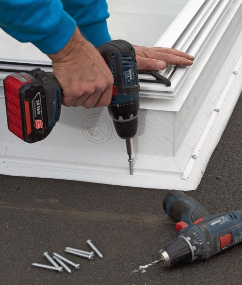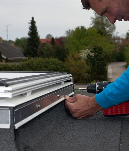 Derfor skrur vi lister på sidene, så belegget ikke glir ned. Deretter avslutter vi med å sette opp regnsensoren og lukke med plastkuppelen.