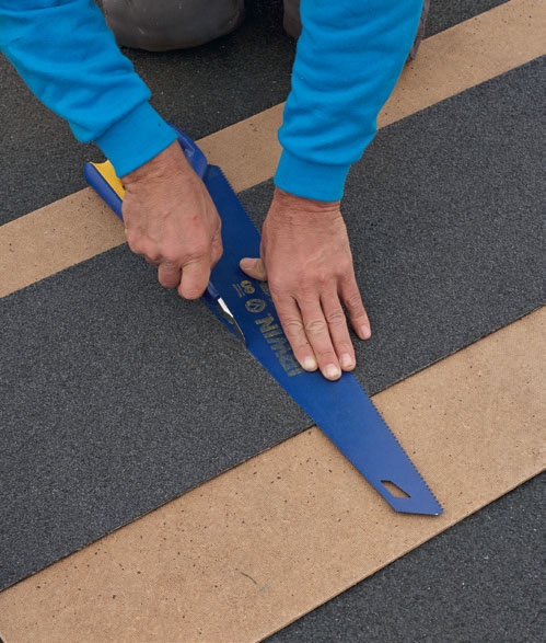 Bitene med takbelegg skjæres til med en skarp kniv. Se veiledningen. Skjær med støtte fra en håndsag eller en tømrervinkel. Da blir stykkene vinkelrette. Det er kanskje litt nerdete, men det ser penere ut.