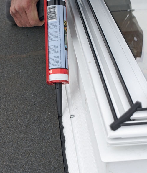 Steng overgangen mellom vindu og belegg med den klebende tettemassen. Det er her risikoen for vanninntrenging er størst.