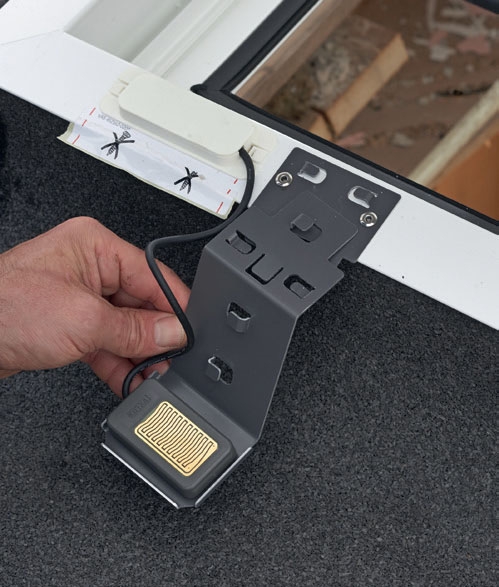Regnsensoren klikkes fast på karmen. Den får vinduet til automatisk å lukke seg, hvis det står åpent når det begynner å regne.