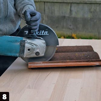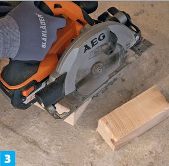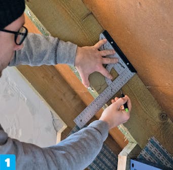 Kapp til to bjelkebiter. De skal passe nøyaktig mellom de ubrutte sperrene. Igjen er det viktig at endene kappes i rette vinkler.