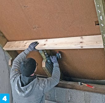 Skru sammen sperreender og den nye bjelken ytterligere med to 6 x 120 mm skruer. Skru dem gjennom siden på den nye bjelken og inn i sperreendene.