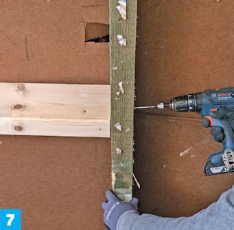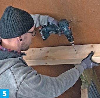 Fest de avkappede lektene. Før du gjør noe annet, skal du skru fast endene av lektene du nettopp har kappet til de vertikale bjelkene du brukte til utvekslingen. Her bruker vi 5 x 70 mm skruer.
