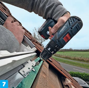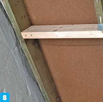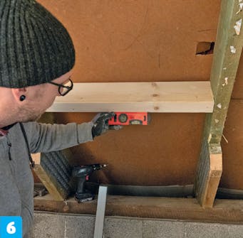 Skru den nye bjelken fast til de ubrutte sperrene. Bruk to 6 x 120 mm skruer til hver sammenføyning. Sjekk at de nye bjelkene fortsatt er i vater.