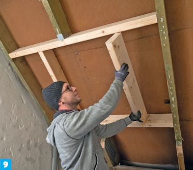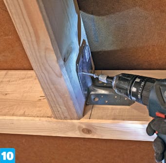 Skru fast en bjelkesko i begge ender av den kappede sperren. Legg den nykappede bjelken på tvers, og skru den fast til bjelkeskoen. Her bruker vi 5 x 70 mm skruer.