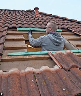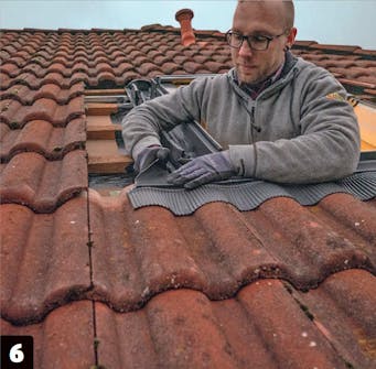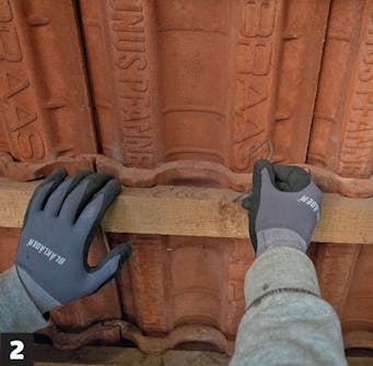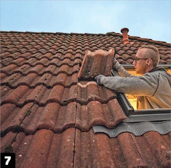 Fjern nødvendige takstein. Disse taksteinene er montert med små metallklips som enkelt kan fjernes fra innsiden. Når dette er gjort, er steinene klare til å løftes vekk.