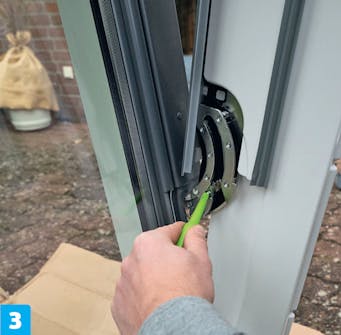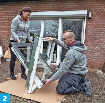 Den indre delen av karmen leveres montert sammen med vindusrammen som holder ruten. De må skilles fra hverandre før den indre delen av karmen kan monteres i den ytre.