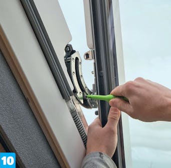 Plasser inndekkingen rundt karmen. Den består av to deler, en myk tekstildel og en hard metall- og plastdel. Det er den myke delen du skal montere først. Løsne skruene som holder lekten under vinduet. Trekk inndekkingen under lekten og skru den fast igjen. Inndekkingen limes også fast til karmen med den medfølgende limstrimmelen.