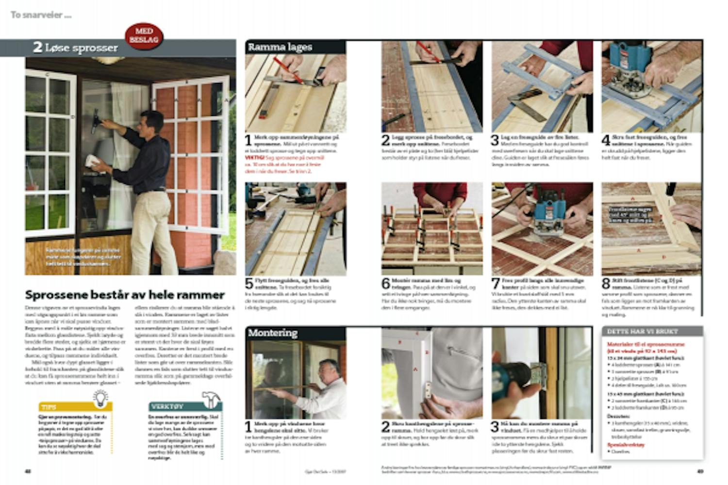 Mål også hvor dypt glasset ligger i forhold til framkanten på glasslistene slik at du kan få sprosserammene helt inn i vinduet uten at ramma berører glasset - ellers risikerer du at ramma blir stående å slå i vinden. Rammene er laget av lister som er montert sammen med blad-sammenføyninger. Listene er saget halvt igjennom med 33 mm brede innsnitt som er stemt ut der hvor de skal føyes sammen. Kantene er frest i profil med en overfres. Deretter er det montert brede lister som går ut over rammekanten. Slik dannes en fals som slutter tett til vindus-ramma slik som på gammeldags overfal-sede kjøkkenskapdører.