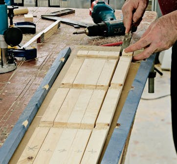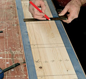 Legg sprosse på fresebordet, og merk opp snittene. Fresebordet består av ei plate og to (her blå) hjelpelister som holder styr på listene når du freser.