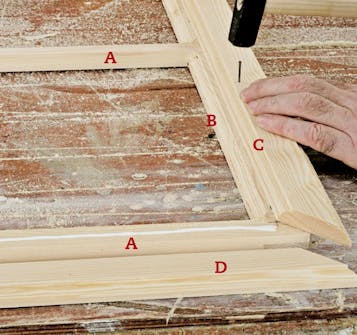 Montér ramma med lim og tvinger. Pass på at den er i vinkel, og sett ei tvinge på hver sammenføyning. Har du ikke nok tvinger, må du montere den i flere omganger.
