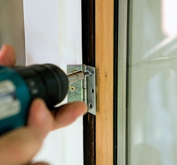 Skru kanthengslene på sprosse-ramma. Hold hengselet løst på, merk opp til skruer, og bor opp før du skrur slik at treet ikke sprekker.