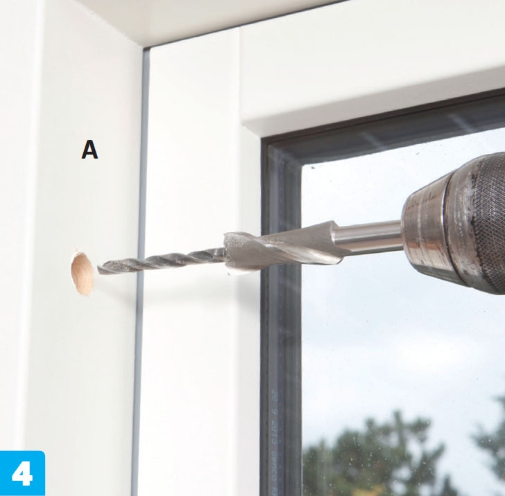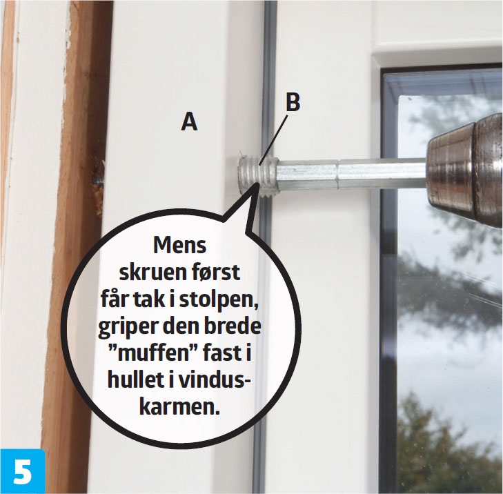 Forbor til skruene i hver side. Her må vi også lage hull i vinduskarmen. Som regel slipper du det, fordi karmen har forborede hull. Med forborede hull, borer du bare hull til skruen i stolpen bak karmen.