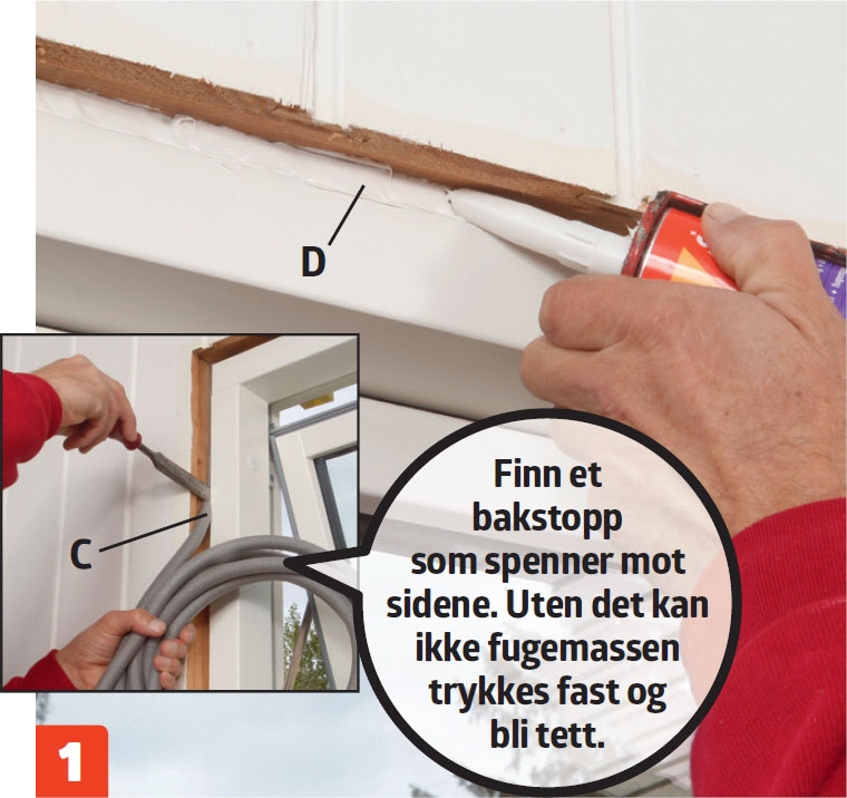 Når vinduet er på plass, skal du tette fugen rundt det. Det er egentlig en kunst, for oppbyggingen skal hindre at luften blåser gjennom fugen, den skal holde på varmen og samtidig gi fukt muligheten til å forsvinne.