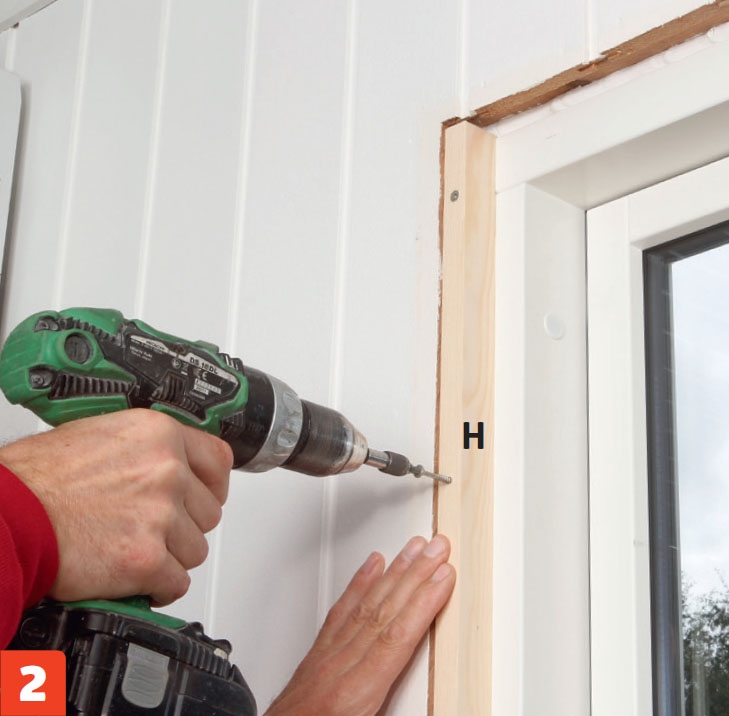 Vi avslutter pent innvendig med utforinger (H). Her bruker vi en løsning der vi har glattkantlister som tilpasses så de flukter med veggen, før de skrus fast inn i vinduet.