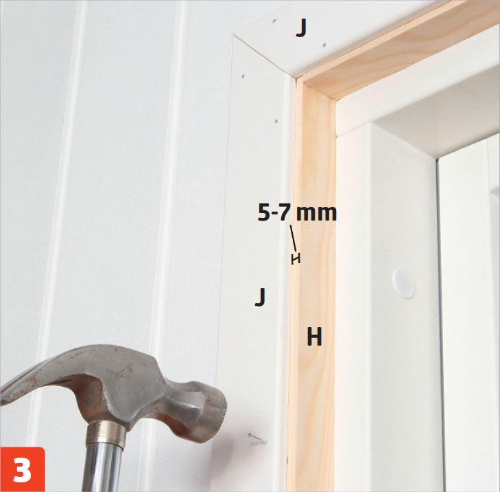 5 mm inn på utforingene (H) setter vi på vinduslister (gerikter) (J), for å avslutte pent mot veggen. Hjørnene gjæres med 45 graders snitt og limes.