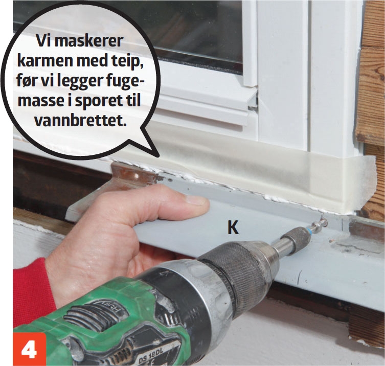 Utenfor setter vi vannbrettet (K) på plass. Bøyen trykkes inn i sporet, som vi har fylt med fugemasse. Vi skrur fast brettet til karmen med 3 x 20 mm rustfrie skruer, før fugemassen glattes pent ut.
