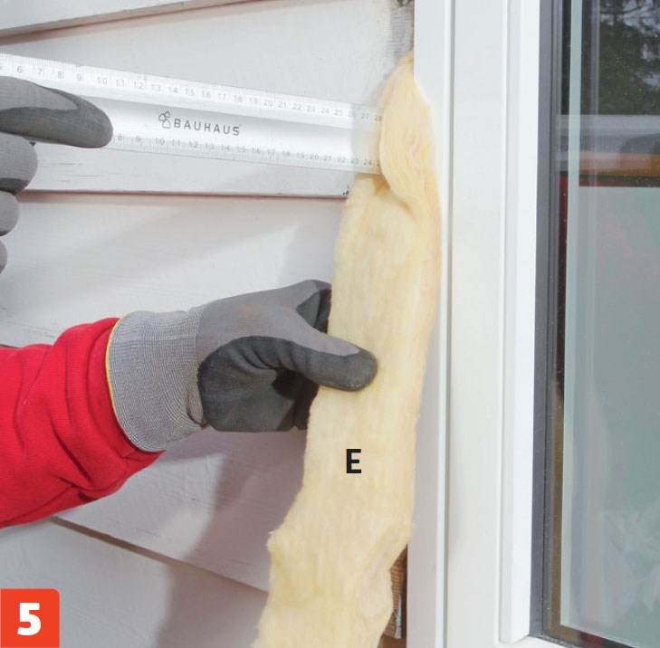 Vi stapper inn en strimmel mineralull (E) i fugen. Fugen skal fylles opp helt inn til den runde bakstoppen på innsiden, så luften ikke sirkulerer. Ikke press så hardt at du presser ut bakstoppen.