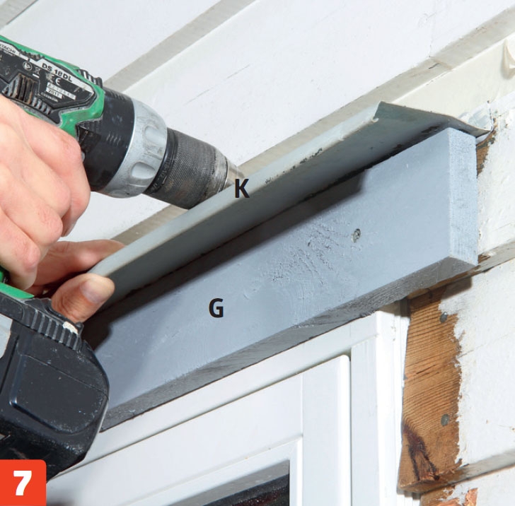 Under vannbrettet (K) plasserer vi et omrammingsbord (G). Det skrus fast med 4 x 50 mm skruer. Bordet har først fått noen strøk med trebeskyttelse.