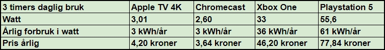 Et langt billigere alternativ til spillkonsollerne er Apple TV og Chromecast. En Apple TV bruker kun 3,01 watt når du strømmer film og serier. Gjør du det 3 timer daglig, er strømforbruket 3 kWh i året, tilsvarende en årspris på 4,20 kroner. En Chromecast bruker litt mindre, 2,6 watt, noe som tilsvarer 3,64 kroner i året, som altså er den billigste løsningen.