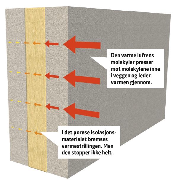Når molekylene på en varm veggflate presser mot molekylene inne i veggen, ledes varmen ut i kulden.