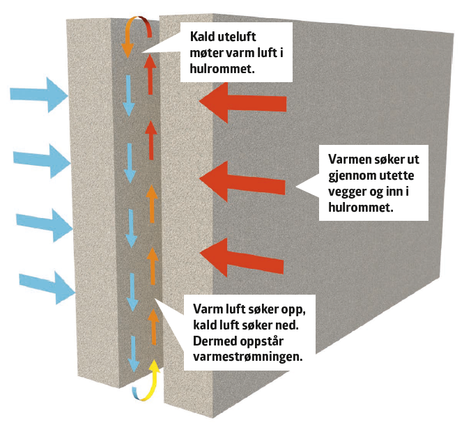 Det samme kan skje i et hulrom i en hulmursvegg: På yttersiden er det en kald flate, på innsiden er det en varm flate. Luften på den varme siden er lettere og søker opp, mens luften på den kalde siden faller ned. Dermed oppstår det sirkulasjon i hulrommet, der den varme luften blir overført til de kalde flatene, slik at huset mister varme.