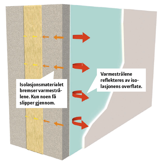 Strålevarmen overføres inne i materialene fra fiber til fiber og vil, hvis den ikke bremses, kunne fortsette for eksempel gjennom en vegg og ut i kulden.