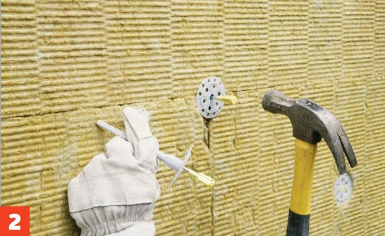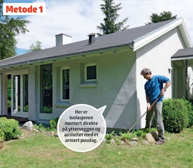 På et murhus monteres isolasjonsmaterialet i de fleste tilfeller direkte på veggen og avsluttes med et integrert pusslag.