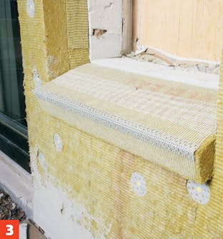 Det gamle vannbrettet i stein er fjernet og erstattet med et vannbrett i mineralull. Det er armert allerede før det første pusslaget, og forkanten er ytterligere forsterket med en sparkelprofil.