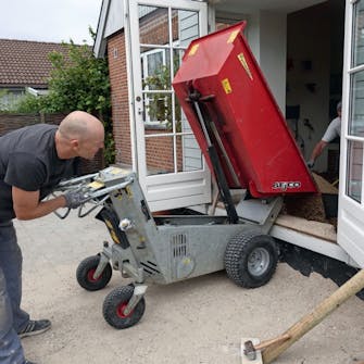 En minidumper er et krav - her lesser vi grus direkte inn i stuen.