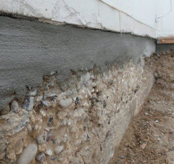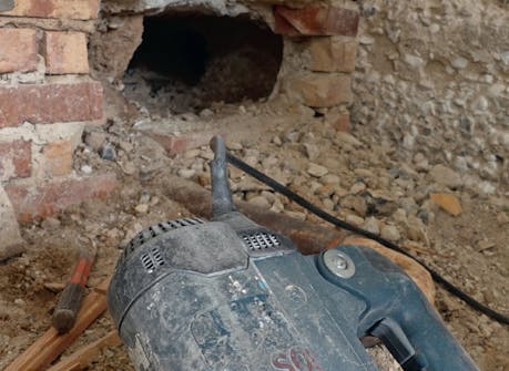 I vårt tilfelle hvilte bjelkene på oppklossede mursteinsfundamenter, slik at det måtte sages, brekkes i stykker og kastes mange tonn ut i en leid kontainer.