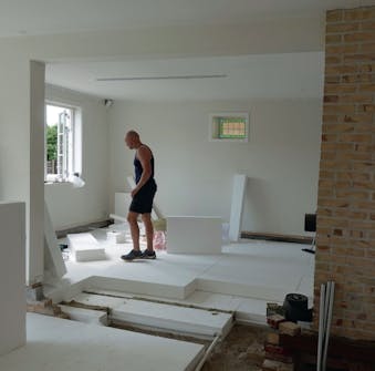 Dermed er gulvet isolert. Krypekjelleren er borte, og det er ikke lenger behov for ventilasjon under gulvet, for polystyrenplatene råtner ikke.