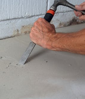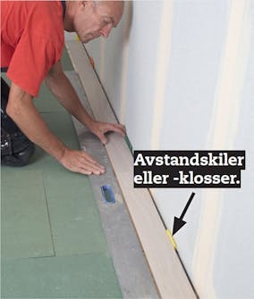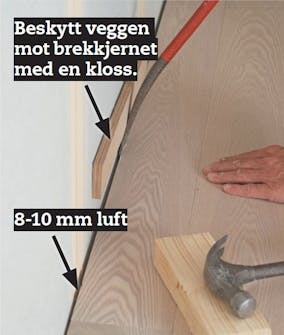 Ofte er du nødt til at slå skjøtene på plass med beherskede slag og en kloss mellom hammer og gulv. Derfor er det viktig å få god støtte bak første rekke.