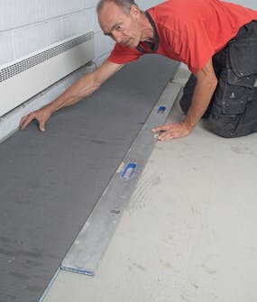 Neste plate føyes til i enden av den første. Fordel flislim der platen skal ligge, trekk en strimmel av det spesielle limet på kanten, og trykk fast platen ned mot gulvet, og kant mot kant.