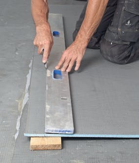 Rett inn kantene på første rekke, slik at de ligger helt rett. Hold et langt vater eller en rettholt på kanten og rett platene på plass. Husk også å få kantene like høye.