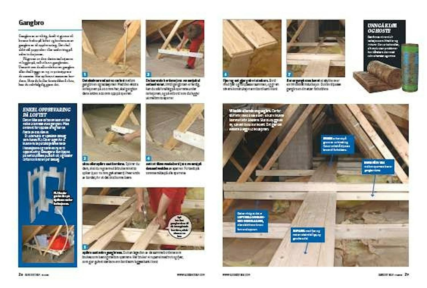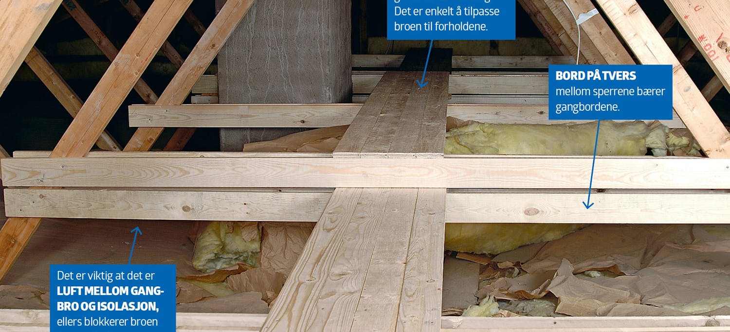 Gangbroen er viktig, fordi vi gjerne vil kunne ferdes på loftet og bruke noe av gangbroen til oppbevaring. Det skal aldri stå pappesker eller andre ting på selve isolasjonen.