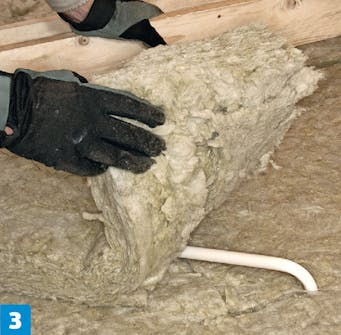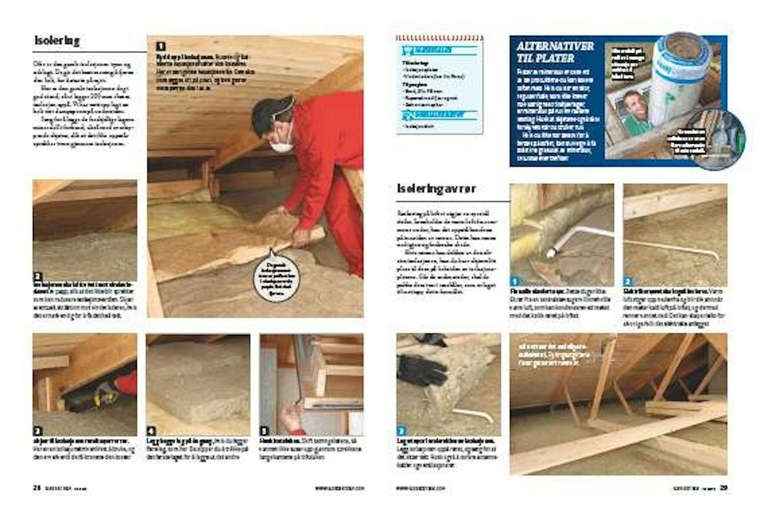 Hvis rørene kan dekkes av den ekstra isolasjonen, kan du bare skjære litt plass til dem på baksiden av isolasjonsplatene. Går de andre steder, skal du pakke dem inn i rørskåler, som er laget til nettopp dette formålet.