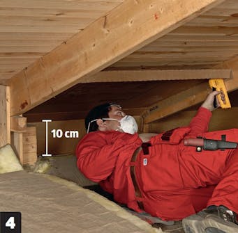 Stift fast vindavlederen til sperrene med en stiftepistol langs begge kantene. Det skal være minst 10 cm fra vindavlede-ren til den nye isolasjonens overside.