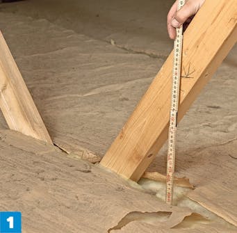 Bøy det nederste stykket av pappen. Mål avstanden fra takbjelken til cirka 20 mm under takets underside for å finne punktet. TIPS: Det er enklest å bøye platene før du klatrer opp på loftet.