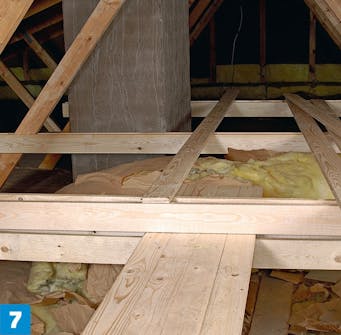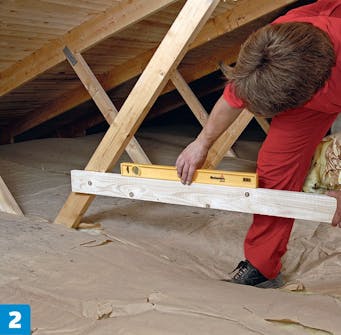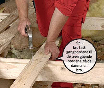 De bærende bordene (21 x 98 mm) skal settes i vater. Inntil gangbroen er ferdig, kan du stå forsiktig på sperrene under isolasjonen, og på et bord som du legger ut mellom to sperrer.
