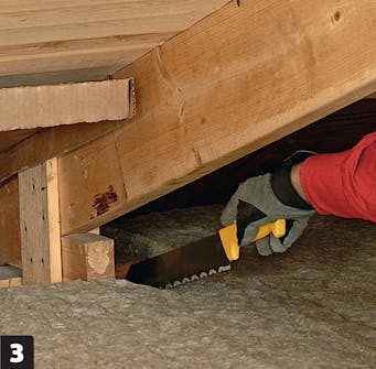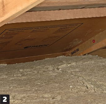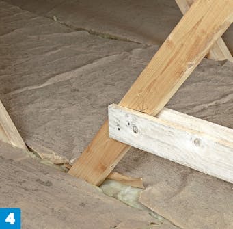 Ventilasjonsspalten langs takfoten skal du aldri blokkere. Her bruker vi et system av vindavledingsplater, som sørger for at luften sirkulerer fritt inn på loftsrommet. De finnes i flere bredder, så du skal finne de som passer sperrene dine. Bruker du ikke et slikt system, skal du forsikre deg om at isolasjonen ikke kan bli dyttet ut foran luftespalten.