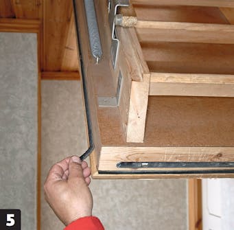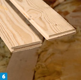 Spikre fast selve gangbroen. Du kan lage den av de samme bordene som brukes som bæring mellom sperrene. Her bruker vi rupanel med not og fjær, som gjør gulvet sterkere enn bord som legges kant i kant.