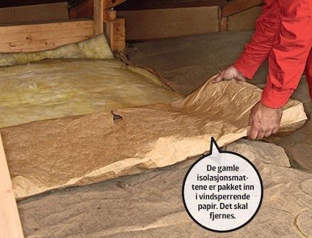 Rydd opp i isolasjonen. Hullete og flatklemte isolasjonsmatter skal kasseres. Her er den gamle isolasjonen fin. Den skal bare legges litt på plass, og den gamle vindsperren skal tas av.