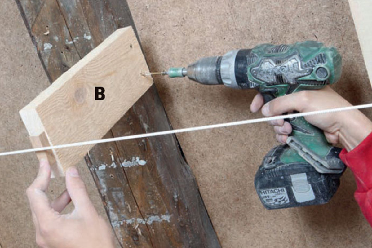Midt på de ytterste sperrene skrus et tredje tverrbord (B) fast. Det rettes inn etter en snor vi har spent ut mellom tverrbordene oppe og nede. For å unngå å dytte til snoren, holdes den unna med klosser.