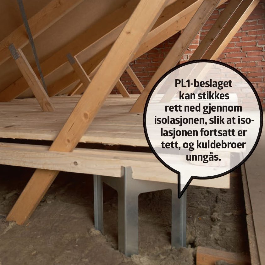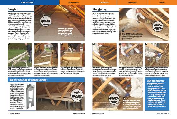 Har du allerede en gangbro, skal du begynne med å forhøye den, slik at du senere kan bevege deg rundt på loftet uten å ødelegge isolasjonen. Det gjøres enklest ved å isolere oppå den eksisterende gangbroen med trykkfaste plater. Oppå den “harde isolasjonen” kan du deretter legge et lag nye gulvplater.