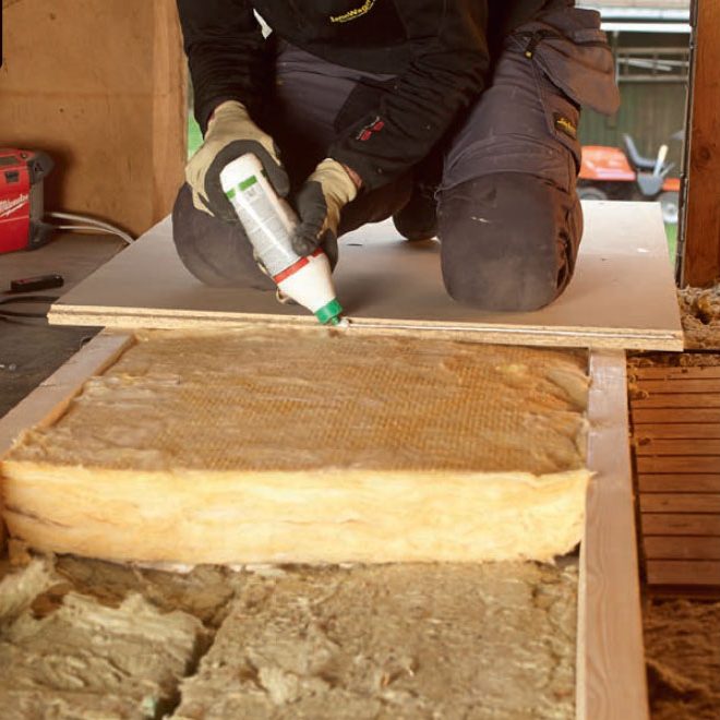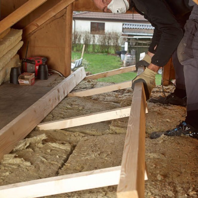 Har du ikke en gangbro på loftet, er det en god idé å benytte muligheten til å bygge en når du likevel skal i gang med å isolere. Her viser vi hvordan du først kan bygge opp underliggende vanger, som er enkle å få opp på loftet, før de foldes ut og du monterer plater oppå.