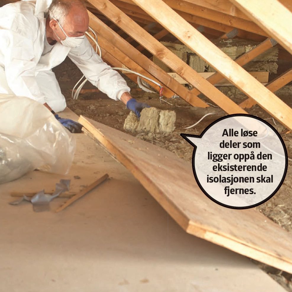 Rydd på loftet, og fjern alt som har hopet seg opp. Loftsrommet skal være tomt og fullstendig ryddet oppå den gamle isolasjonen.