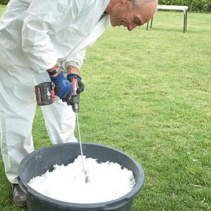 Rør rundt i baljen med en blandevisp på bormaskinen, så granulatet “løsner” til små dotter, som passer inn alle steder.