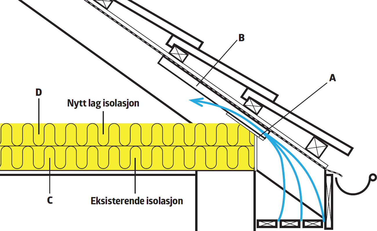 Når du legger et tykkere lag isolasjon på loftet, er det fare for at du blokkerer den ventilasjonen som skal holde loftsrommet tørt og friskt. Det er viktig at det kommer opp luft fra takfoten, og at den kan trekke uhindret opp på oversiden av isolasjonen. Du kan sikre en god ventilasjon ved hjelp av en masonittplate (A) og tre lekter (B). De monteres til takstolene, og sikrer at den forhøyede isolasjonen (D) ikke stenger for ventilasjonen.