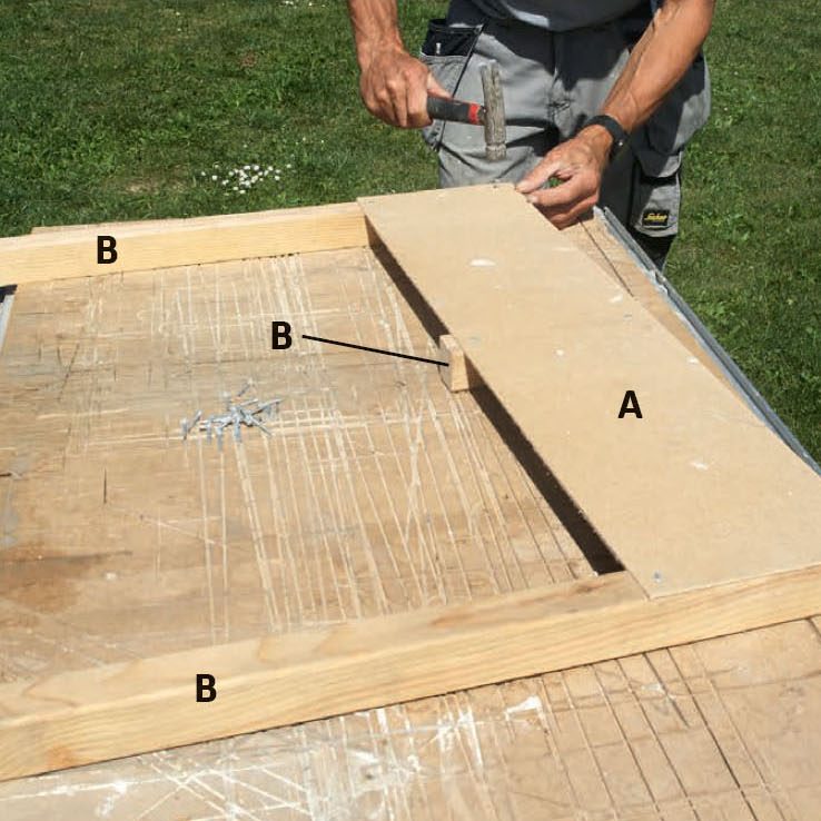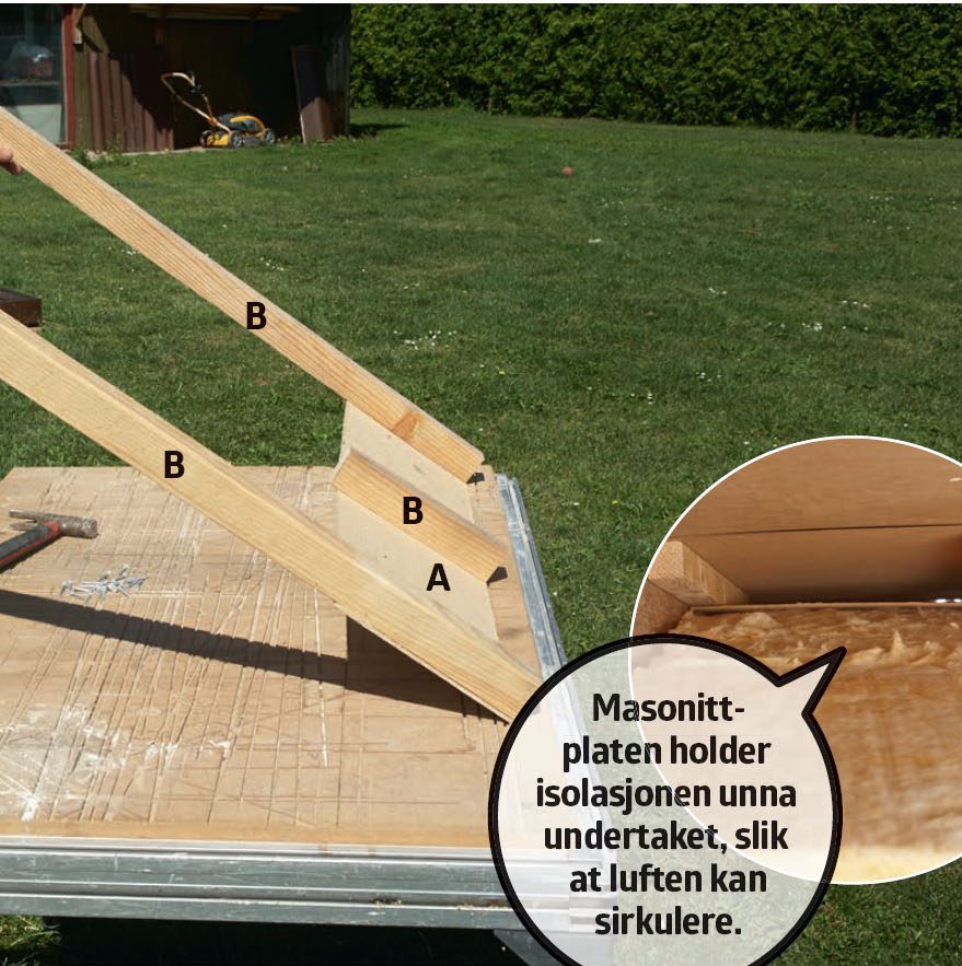 Et stykke masonittplate (A) tilpasses, slik at den passer med avstanden mellom takstolene. Platen spikres fast til to lange og en kort lekt (B).